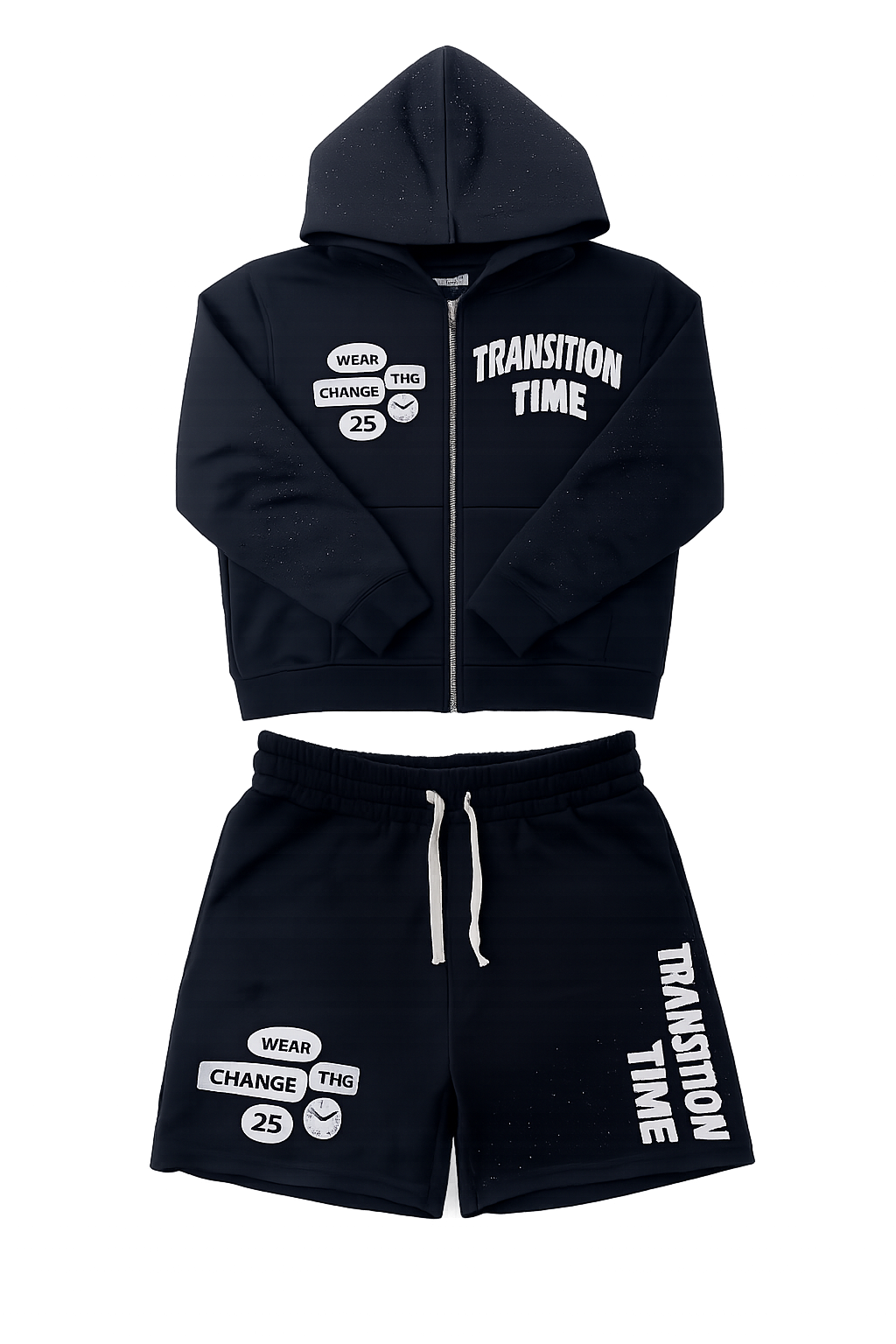 A heavyweight 400 GSM zip-up hoodie and shorts crafted from premium cotton blend, finished in deep black with black subtle Rime Stone detailing, white distressed writing and badge work. Which is warm, durable, and built for everyday wear all year round.